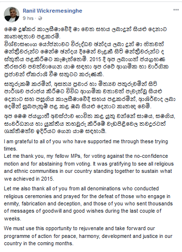 කොහොමවුනත් විශ්වාසභංගය පරාජය කිරීමෙන් පසුව අග්රාමාත්ය රනිල් වික්රමසිංහ මහතා සිය ෆේස්බුක් පිටුව ඔස්සේ ස්තුති කර තිබුණේ මෙලෙසයි.