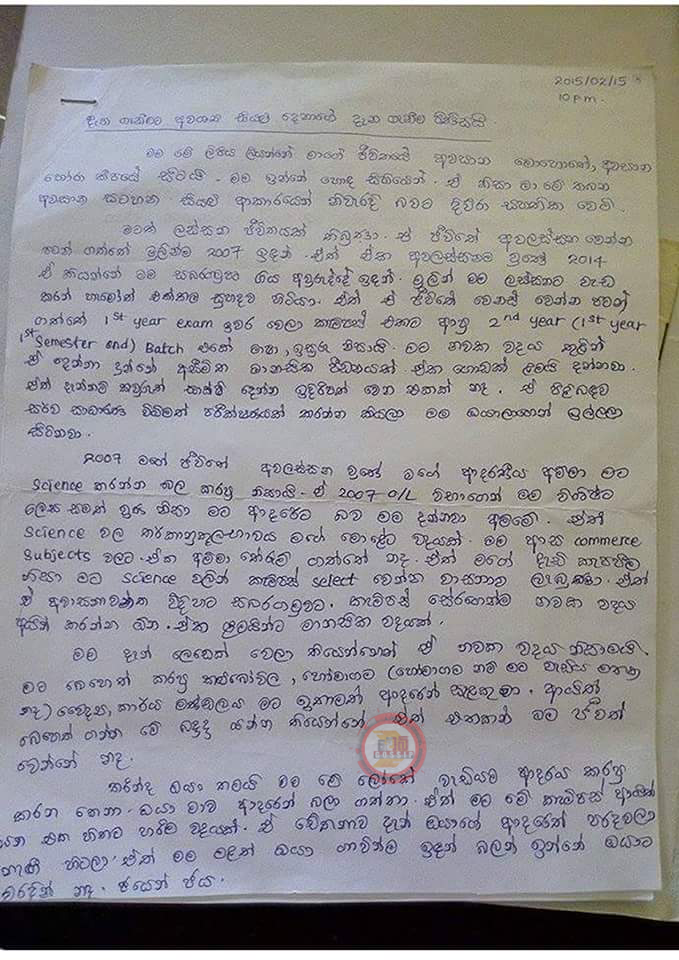අමාලි චතුරිකා මිය යාමට පෙර ලිපි කිහිපයක් ලියා සබරගමු විශ්ව විද්යාලයේදී තමන් මුහුණ පෑ භයානක ඉරණම පිළිබදව විස්තර කර තිබුනා.