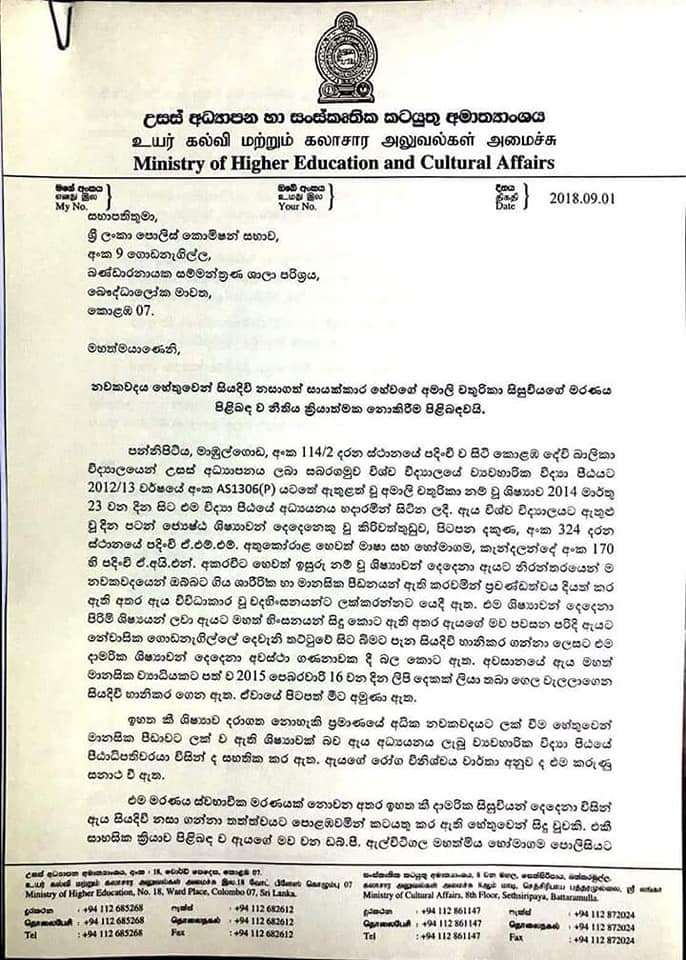 අමාලි චතුරිකා නම් එම සිසුවියගේ මරණයට අදාළ සාක්ෂි පොලිසියට ලබා නොදීම සහ වසන් කිරීම සම්බන්ධයෙන් එවකට උපකුලපති මහාචාර්ය චන්දන උඩවත්ත මහතාට එරෙහිව නඩු පැවරීමට කටයුතු කරන ලෙස ද සියදිවි නසා ගැනීමට අදාළ පැමිණිල්ල සම්බන්ධ පරීක්ෂණ පැවැත්වීම සහ නඩු පැවරීම පැහැර හැරීම පිළිබඳව හෝමාගම පොලිසියේ එවකට සිටි පොලිස් ස්ථානාධිපතිවරයාට එරෙහිව පරීක්ෂණ පවත්වා සුදුසු දඬුවමක් ලබාදෙන ලෙසද ඇමැතිවරයා තවදුරටත් ඉල්ලා තිබෙනවා.