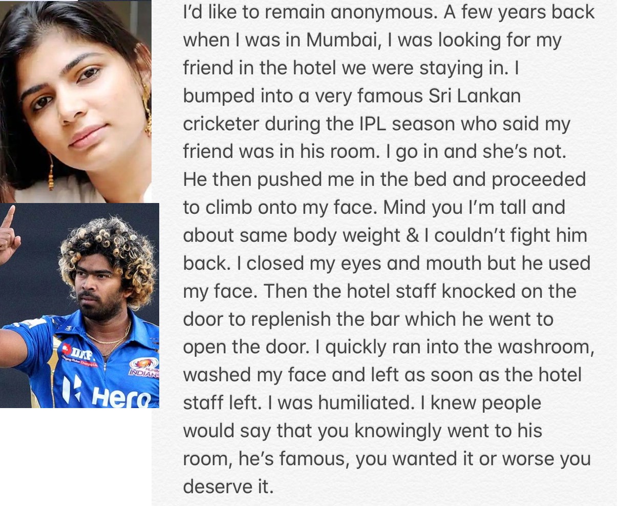 මේ අනුව යමින් හිටපු ශ්රී ලංකා ක්රිකට් නායක අර්ජුන රණතුංග තමන්ට හිරිහැරයක් කළ බවට එක් කාන්තාවක සිය ෆේස් බුක් ගිණුමේ සටහන් තබා ඇති අතර තවත් කාන්තාවක් විසින් සුපිරි ක්රීඩක ලසිත් මාලිංග තමන්ට හිරිහැර කළ බවට ට්විටර් සටහනක් තබා තිබෙනවා.
