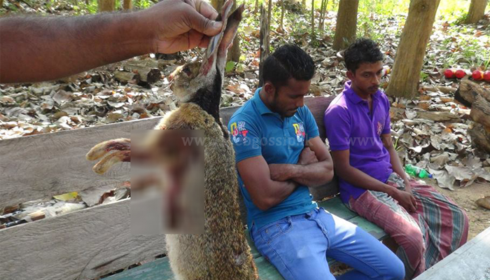 අලුයම තුනට පමණ විදුලි පන්දම් එළියක් දැක රක්ෂිතයේ සැඟවී සිටිමින් දඩයමේ ගොස් නැවත නිවෙස් බලා යමින් සිටි මෙම පුද්ගලයන් දෙදෙනා අත්අඩංගුවට ගෙන තිබෙනවා.