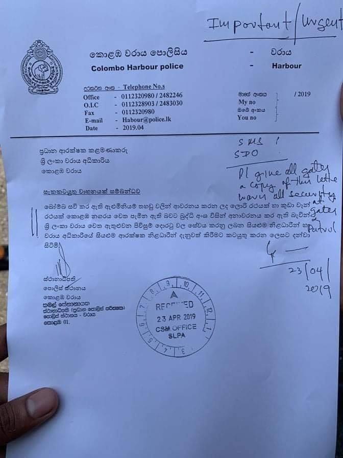 අදාළ නිවේදනයේ දැක්වෙන්නේ ශ්‍රී ලංකා වරාය වෙත ඇතුළුවන පිවිසුම් දොරටු වල සේවය කරනු ලබන සියළුම නිළධාරීන් හා වරාය අධිකාරියේ සියළුම ආරක්ෂක නිළධාරීන් දැනුවත් කිරීමට කටයුතු කරන බවයි.