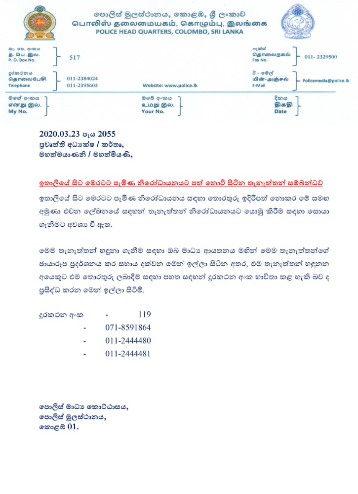 ඉතාලියේ සිට මෙරටට පැමිණ නිරෝධායනයට පත් නොවී සිටින පුද්ගලයන් ගැන පොලිසිය විශේෂ නිවේදනයක් නිකුත් කර තිබෙනවා.