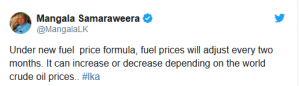 ට්විටර් පණිවුඩයක් නිකුත් කරමින් මුදල් අමාත්‍ය මංගල සමරවීර පවසන්නේ නව මිල සූත්‍රය අනුව මාස දෙකෙන් දෙකට ඉන්ධන මිල අඩුවිය හැකි බවයි. ලෝක වෙළඳ පොළෙහි තෙල් මිල අනුව එම අඩු වැඩි වීම සිදුවන බවත් ඔහු පවසා තිබෙනවා.