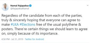 නාමල් රාජපක්ශ ට්විටර් හරහා ඉල්ලීමක් කර තිබෙනවා. ඒ,