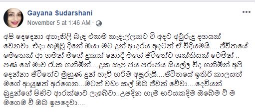මේ ගැන ගයනා සහ ඇගේ ආදරණීය සැමියා වන සහන සිය මුහුණුපොතට මෙවන් සටහනක් දමා තිබුණා.