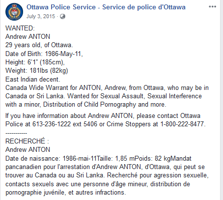 එමෙන්ම මෙම පුද්ගලයා ගැන තොරතුරක් දන්නේනම් කැනඩාවේ ඔට්ටාවා පොලිසියේ 613-236-1222 හෝ 1-800-222-8477 අංකවලට දැනුම්දෙන බවටත් ඔවුන් සිය ෆේස්බුක් සහ ට්විටර් නිවේදන මගින් පෙන්වා දී තිබෙනවා.
