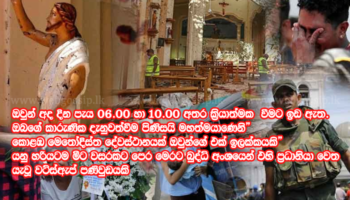 ”ගරු කටයුතු මහත්මයාණෙනි, සුබ උදෑසනක්. ඔවුන් අද දින පැය 06.00 හා 10.00 අතර ක්රියාත්මක වීමට ඉඩ ඇත. ඔබගේ කාරුණික දැනුවත්වීම පිණිසයි මහත්මයාණෙනි” කොළඹ මෙතෝදිස්ත දේවස්ථානයක් ඔවුන්ගේ එක් ඉලක්කයකි” යනු හරියටම මීට වසරකට පෙර මෙරට බුද්ධි අංශයෙන් එහි ප්රධානියා වෙත යැවූ වට්ස්ඇප් පණිවුඩයකි.