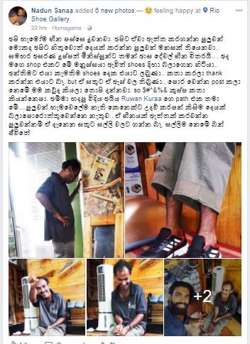 “අපි හැමෝම හීන පස්සෙ දුවනවා. අපිට ඒවා ඇත්ත කරගන්න පුලුවන් මොකද අපිට හිතුවොත් දෙයක් කරන්න පුලුවන් මනසක් තියෙනවා.. සමහර අසරණ දුප්පත් මිනිස්සුන්ට තමන් ආස දේවල් හීන විතරයි.. . අද මගෙ shop එකට මේ මනුස්සයා ඇවිත් shoes දිහා බලාගෙන හිටියා.. අන්තිමට එයා කැමතිම shoes දෙක එයාට ලබුණා.. කතා කරලා thank කරන්න එයාට බෑ. but ඒ සතුට ඒ ඇස් වල තිබුණා.. පොර වෙන්න post කලා නෙමේ මම කවුද කියලා තොපි දන්නවා. so $#^&%& කුප්ප කතා කියන්නෙපා. අම්මා හදපු විදිය අයිය Ruwan Kuraa ගෙ path එක තමා මේ….පුලුවන් හැමවෙලේම නැති කෙනෙක්ට උදව් කරපන් කිසිම දෙයක් බලාපොරොත්තුවෙන්නෙ නැතුව.. ඒ හීනයක් ඇත්තක් කරවන්න පුලුවන්නම් ඒ දැනෙන සතුට සල්ලි වලට ගන්න බෑ. සල්ලිම නෙමේ බන් ජීවිතේ”