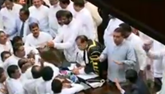 මේ අතර පාර්ලිමේන්තුවේ අද ඇතිවූ උණුසුම් තත්ත්වයත් සමග සභාවේ රැදී සිටි කිසියම් මන්ත්රීවරුන් පිරිසක් කතානායකවරයාට කසල බඳුනකින් සහ වතුර බෝතලයකින් පහර දී ඇති බවට වාර්තාවනවා.