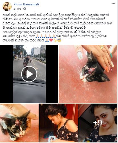 අනේ දෙවියනේ කාගේ හරි අතින් වැරදිලා හැප්පිලා..එත් මනුස්ස කමක් තිබ්බා මෙ අසරණ සතාව පාර අයිනකින්වත් තියන්න.එත් කියන්නත් දුකයි.දැං කාලේ මනුස්සකමත් බල්ලට ගිහින්. පුස් පැටියගේ පිනකට මම ම දැක්කා.අනේ තුවාල වෙලා මට පුලුවන් විදිහට ගෙදරට ගෙනල්ලා. තුවාලෙට දැනට බෙහෙත් දාලා එයාට කිරි ටිකක් හදලා බොන්න.දිලා නිදි කරා මේ වගේ අසරණ සත්තු දැක්කම පිහිටක් වන්න පිං සිද්ද වෙයි.