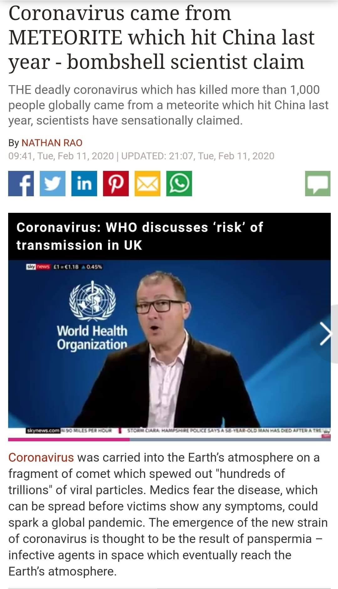 විදෙස් මාධ්ය වාර්තාවක දැක්වෙන්නේ කොරෝනා වෛරසය චීනයට පැමිණියේ උල්කාපාතයකින් බවයි.