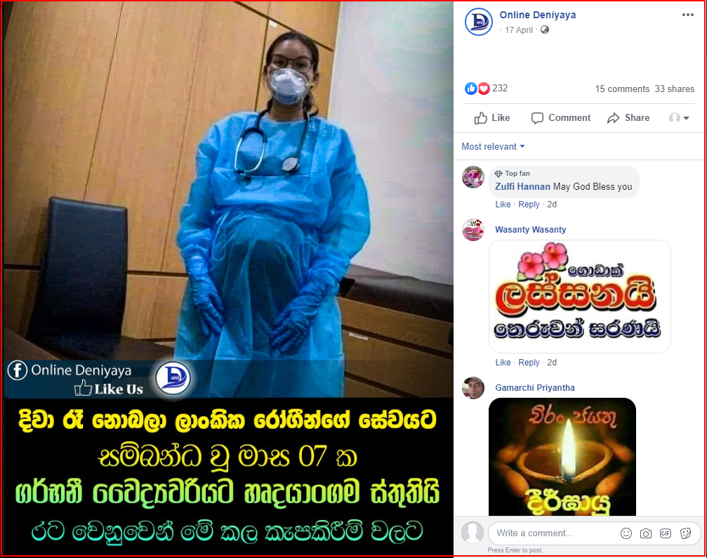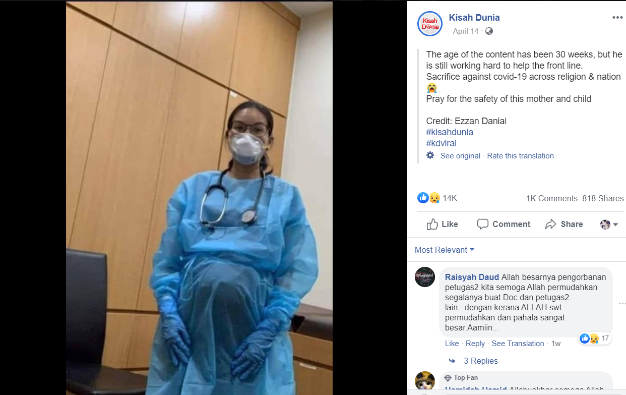 ෆේස්බුක් සටහනකට මෙම ඡායාරූපය අප්රේල් 14 වැනි දින එක්කර ඇති අතර එහි සඳහන් වූයේ් මැලේසියානු වෛද්යවරිය සති 30 ක ගැබිණියක් බවයි.