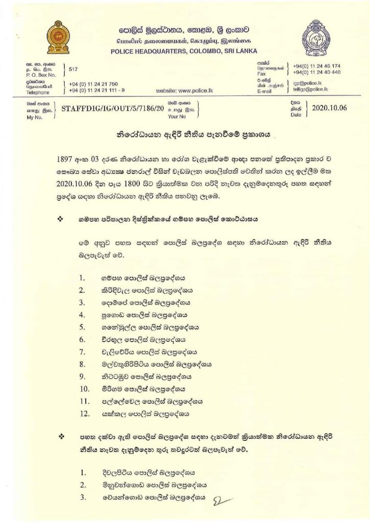 ගම්පහ දිස්ත්රික්කයේ ප්රදේශ 15 ක් සඳහා ඇඳිරිනීතිය හා සංචරණ සීමා පනවා තිබෙනවා.