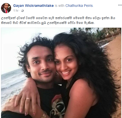 ගයාන් ඔවුන් දෙදෙනාගේ ඡායාරූපයක් යොමු කරමින් කියා තිබුනේ “උපන්දිනේ දවසේ වගේම ගෙවෙන හැම තත්පරයක්ම මෙහෙම හිනා වෙලා ඉන්න.ඔය හිනාහව මාව ජීවත් කරවනවා.සුබ උපන්දිනයක්ම වේවා මගෙ මැණික” කියලායි.