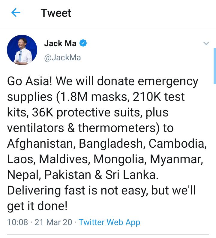 ජැක් මා පදනම සහ අලිබබා පදනම ශ්‍රී ලංකාව ඇතුළු ආසියානු රටවලට වෛද්‍ය සැපයුම් පරිත්‍යාග කරන බව නිවේදනයක් නිකුත් කරමින් පවසා තිබෙනවා.