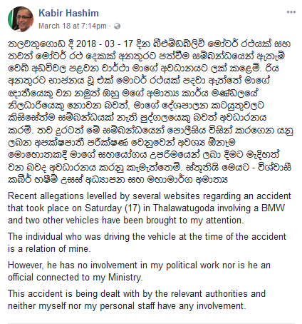 තලවතුගොඩ දී 2018 – 03 – 17 දින බී.එම්. ඩබ්ලිව් මෝටර් රථයක් සහ තවත් මෝටර් රථ දෙකක් අනතුරට පත්වීම සම්බන්ධයෙන් ඇතැම් වෙබ් අඩවිවල පළවන වාර්ථා මාගේ අවධානයට ලක් කළෙමි. රිය අනතුරට භාජනය වූ එක් මොටර් රථයක් පදවා ඇත්තේ මාගේ ඥාතීයෙකු වන නමුත් ඔහු මගේ අමාත්‍ය කාර්ය මණ්ඩලයේ නිලධාරියෙකු නොවන බවත්, මාගේ දේශපාලන කටයුතුවලට කිසිසේත්ම සම්බන්ධයක් නැති පුද්ගලයෙකු බවත් අවධාරනය කරමි. තව දුරටත් මේ සම්බන්ධයෙන් පොලීසිය විසින් කරගෙන යනු ලබන අපක්ෂපාතී පරීක්ෂණ වෙනුවෙන් අවශ්‍ය ඕනෑම මොහොතකදී මාගේ සහයෝගය උපරිමයෙන් ලබා දීමට මැදිහත් වන බවද අවධාරනය කරනු කැමැත්තෙමි.