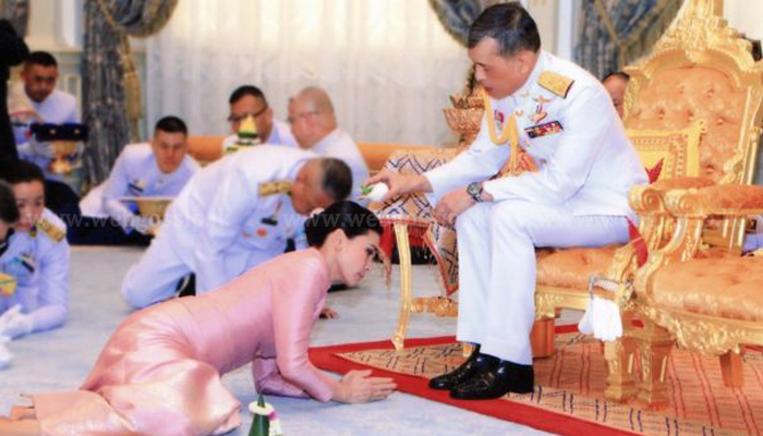 මහා වජිරාලෝන්ග්කෝර්න් රජතුමා තම දේවිය වන සුතිදා රැජිනගේ හිස මත පාරිශුද්ධ ජලය ඉසීමෙන් අනතුරුව රාජකීය නව යුවළ විවාහ ලේකම් පුස්තකයෙහි අත්සන් තැබුවා.