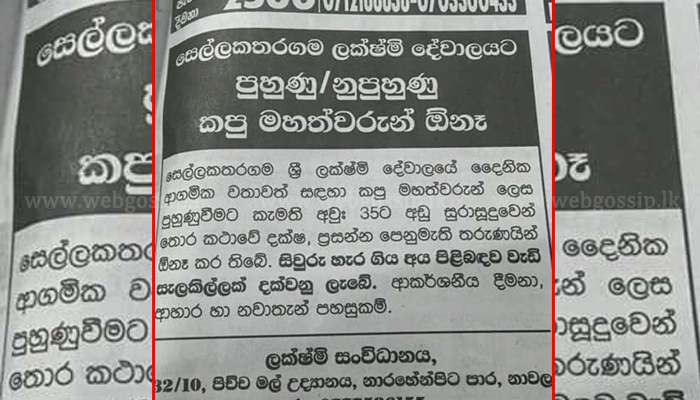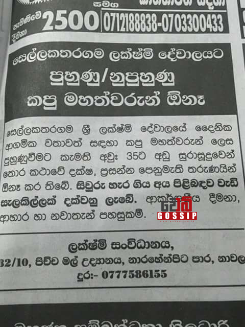 එහි තිබුණේ සෙල්ලකතරගම ලක්ෂ්මි දේවාලයට පුහුණු/නුපුහුණු කපුමහත්වරුන් අවශයි කියලා.