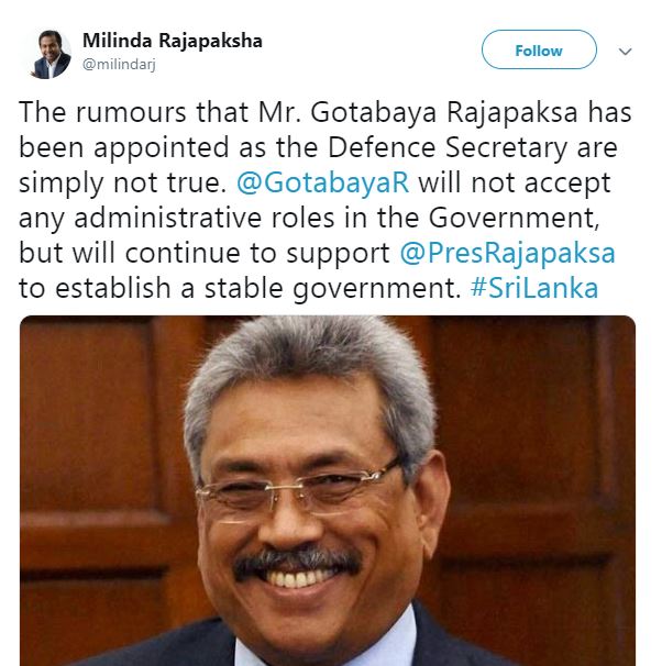 සිය නිල ට්විටර් ගිණුමේ සටහනක් තබමින් ඔහු ප්රකාශ කර තිබුණේ ගෝඨාභය රාජපක්ෂ මහතා නව ආණ්ඩුවේ කිසිදු තනතුරක් පිළි නොගන්නා බවයි.