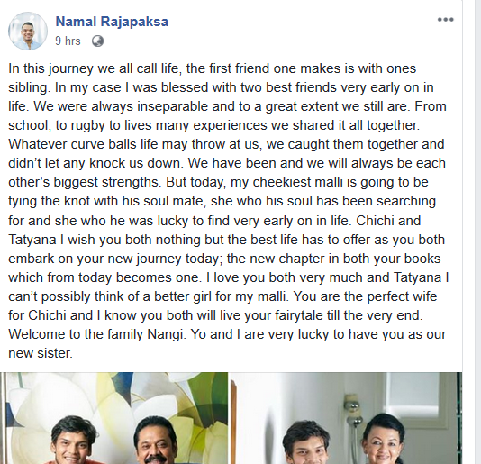 නාමල් සහ යෝෂිත තමන්ගේ මල්ලී චිචීට සුබ පතා සමාජජාල මාධ්‍යයන්ට එක්කෙරූ සටහන මෙන්න