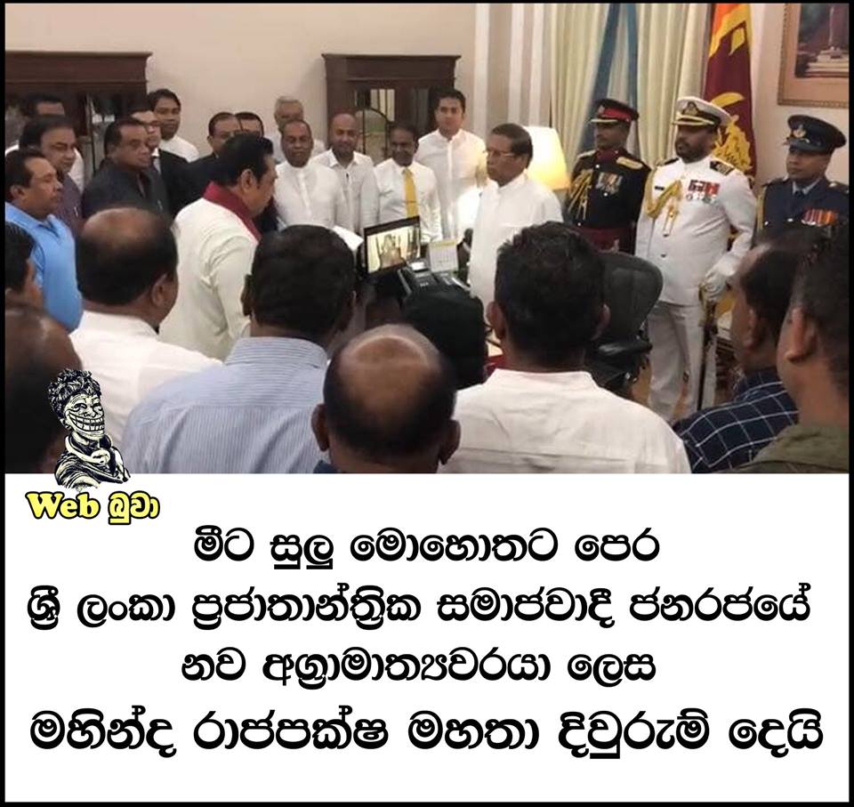 හදිසේම හිටපු ජනපති මහින්ද රාජපක්ෂ මහතා අගමැති ලෙස දිවුරුම් දීම ගැන සමාජ මාධයේ පළ වූ අපූරු නිර්මාණ කිහිපයක් පහතින්….