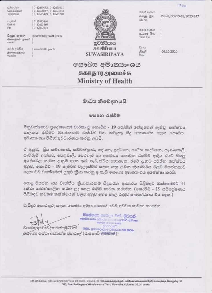 පවතින කොරෝනා වාතාවරණය මත සියලු ප්රිය සම්භාෂණ නවත්වන ලෙස සෞඛ්ය අමාත්යාංශය නිවේදනය කරනවා…