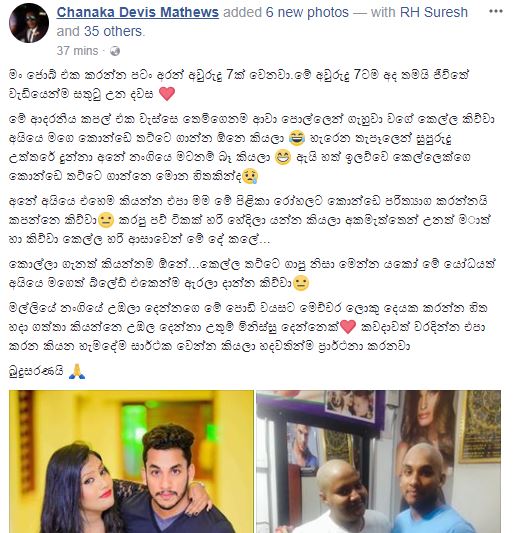 ඊයේ දිනයේදී ෆෙබුක් ගිණුමක් තුළ දක්නට ලබූ මෙම සටහන ගැන බොහෝ දෙනෙක් කතා බහට ලක්වුණා… ඒ තරුණ යුවලක් තමන්ගේ සම්පුර්ණ කොණ්ඩය පිළිකා රෝගීන් වෙත පරිත්යාග කළ සිදුවීමක් ගැන ඔවුන් දෙදෙනාගේ කොණ්ඩය කැපු පුද්ගලයා දැක්වූ සටහනක්…