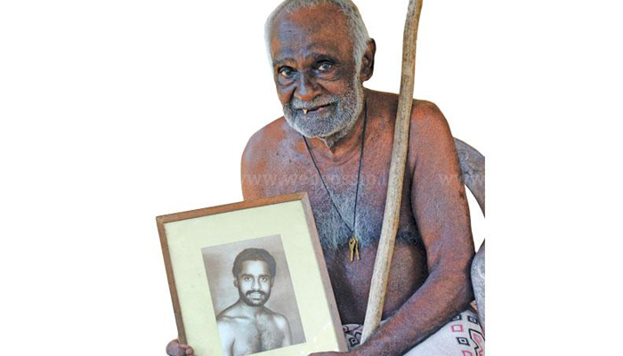කළු නූලක ඇමිණූ යතුරු දෙකක් ඔහු ගෙලේ පැලඳ සිටී. උඩුකය නිරාවරණය කරගෙන සිටින ඔහුගේ දෑතට තුරුලුව ඇත්තේ දිගු රිටකි.