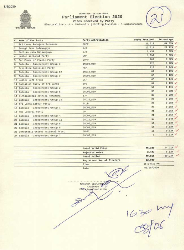 බදුල්ල දිස්ත්රික්කයේ ඌව පරණගම ඡන්ද බල ප්රදේශයේ ප්රතිඵල පහතින්..