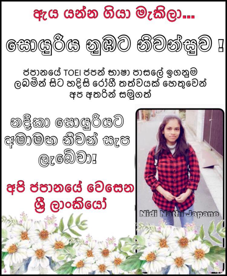 ශ්රී ලාංකික යුවතියක් ජපානයේ අධ්යාපනය ලබමින් සිටියදී ඇතිවූ හදිසි අසනීපයකින් මියගිය පුවතක් වාර්තා වනවා.