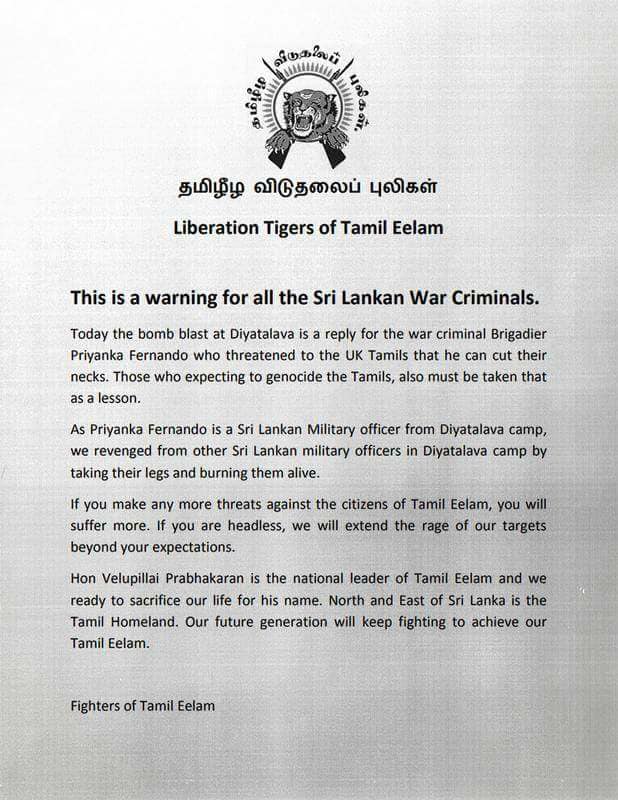 එම ලිපියේ සඳහන් වුණේ Fighters Of Tamil Eelam නම් සංවිධානයක් විසින් එම පිපිරීමට අදාල වගකීම භාර ගන්නා බවයි.