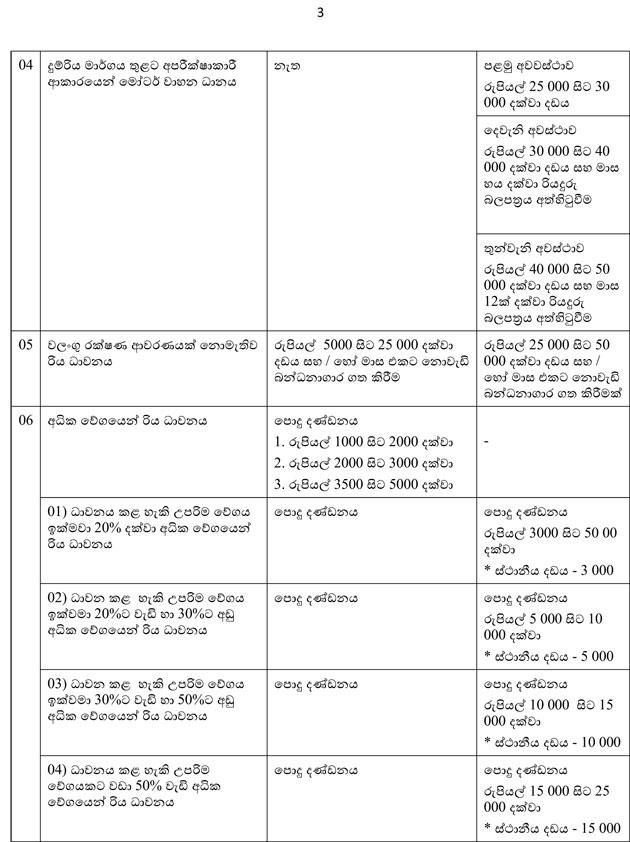 කෙසේවෙතත් දැන් රථ වාහන සම්බන්ධයෙන් වන වැරදි සඳහා දඩ මුදල් වැඩි කර තිබෙනවා. ඒ අනුව අවම දඩය රුපියල් 25,000 දක්වා වැඩි කිරීමට ගැසට් නිවේදනයක් ඊයේ මධ්‍යම රාත්‍රියේ නිකුත් කෙරුණා.