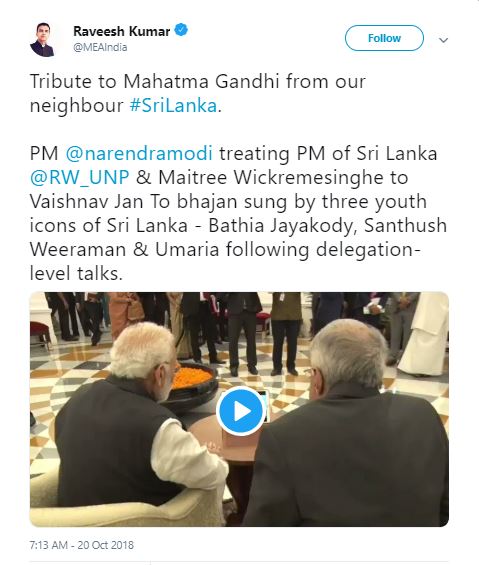 ”තම අසල්වැසි රට වන ශ්රී ලංකාව මහත්මා ගාන්ධිොතුමාට උපහාර දක්වයි” යනුවෙන් ඉන්දියානු විදේශ කටයුතු අමාත්යංශයේ මාධ්ය ප්රකාශක වන රවීෂ් කුමාර් මහතා ඔහුගේ ට්විටර් ගිණුයේ සඳහන් කර තිබෙනවා.