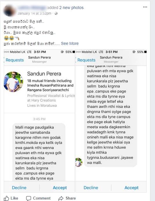 “මල්ලි මගේ පුද්ගලික ජීවිතේ සම්බන්ධ කර ගන් නැත්නම් ගොඩක් කැමති. මොකද එයා කෙල්ලෙක් ඔයාට ඒවා ගානක් නැති වෙන්න පුළුවන්.ඒත් මට එයාව ගොඩක් වටිනවා. ඒක නිසා කරණාකරලා ජීවිත සෙල්ලම් බඩු කර ගන්න එපා. කැම්පස් එකේ පේජ් එකට මැසේජ් දාලා තියෙන්නේ එයා. මොකද එයාගේ ලෙටර් එක තාම ඇවිත් නැති නිසා. ඒක නිසා තමයි ඔයාලගේ පේජ් එකට මැසේජ් දාලා තියෙන්නේ. කැම්පස් එකේ පේජ් එකක් හැටියට මීට වඩා දැක්මකින් වැදගත් කමක් තියන්න ඕනිනේ මල්ලි. මගේ කෙල්ලගේ ජීවිතේ එක්කයි ඔයා මේ සෙල්ලම් කරන්න හැදුවේ කියලා මතක තියා ගන්න..”