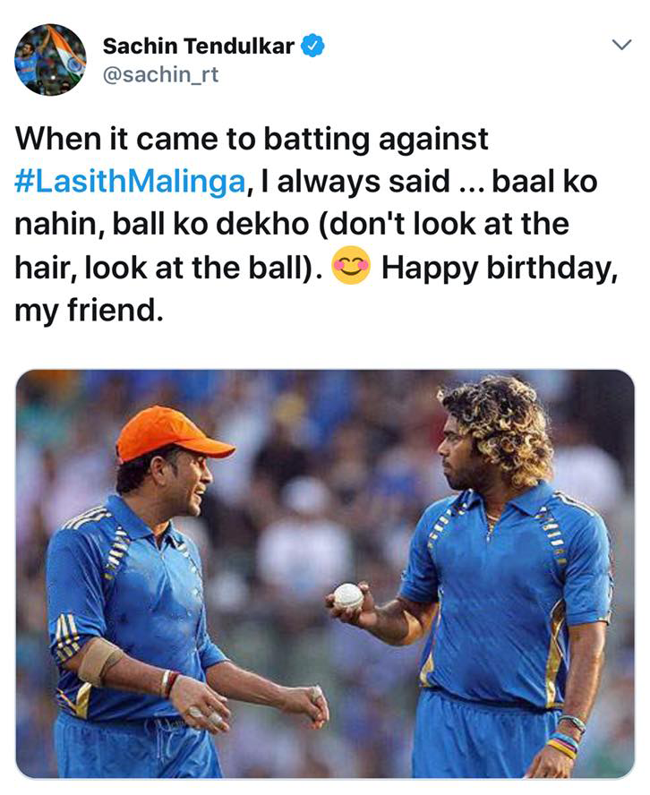 ඉතින් මාලිංගට, ක්රිකට් පිටියේ වැඩිම ලකුණු රැස්කළ සුපිරි ක්රීඩකයෙක් වන සචින් ටෙන්ඩුල්කාර් ට්විටර් හරහා සුභ පතා තිබූ ආකාරය සමාජජාල වල ව්යාප්ත වෙන්න පටන් අරන් තියෙනවා.