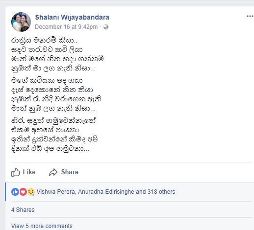 ඒකට හේතුව තමයි ඇය මෙම ගීතයේ පද පේලිය සිය මුුහුණුපොතේ සටහනක් තැබීම.