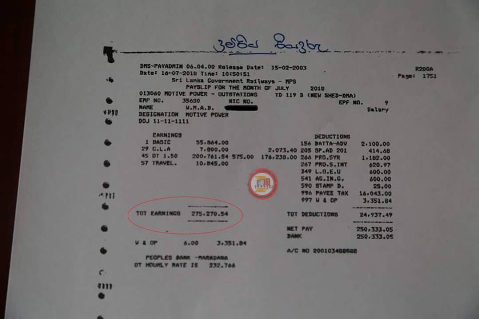 පැයකට රුපියල් 349.1505 බැගින් පැය 575ට රුපියල් 200,761.54ක් අතිකාල ලෙසින් දුම්රිය දෙපාර්තමේන්තුව ගෙවලා.