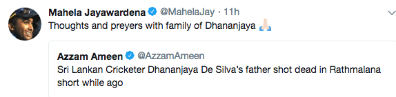 මේ අතර ශ්රී ලංකා ක්රිකට් කණ්ඩායමේ හිටපු නායකයන් දෙපළක් වන මහේල ජයවර්ධන සහ කුමාර් සංගක්කාර ධනංජයගේ පියාගේ අභාවය සම්බන්ධයෙන් ට්විටර් සටහනක් තබා තිබෙනවා.