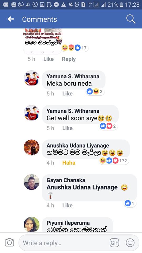 එහි කිසිඳු සත්‍යතාවයක් නොමැති අතර එම සටහනකටම අනුෂ්ක අදහස් දක්වමින් පවසා තිබුණේ “හම්මටසිරි මම මැරිලා යනුවෙන්””