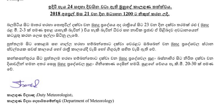 කාලගුණ විද්යා දෙපාර්තමේන්තුව නිවේදනයක් නිකුත් කරමින් සඳහන් කරන්නේ පුත්තලම සිට කොළඹ සහ ගාල්ල හරහා හම්බන්තොට දක්වා වෙරළට ඔබ්බෙන් වන මුහුදු ප්රදේශවල ස්ථාන ස්වල්පයක සවස් කාලයේ හෝ රාත්රී කාලයේදී වැසි හෝ ගිගිරුම් සහිත වැසි ඇති වන බවයි.
