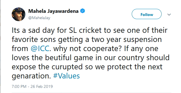සනත් ජයසූරියට ජාත්යන්තර ක්රිකට් කවුන්සිලය විසින් පැනවූ වසර දෙකක ක්රිකට් තහනම පිළිබඳව සිය ට්විටර් ගිණුමෙන් අදහස් දක්වමින් ඔහු මේ බව ප්රකාශ කර තිබෙනවා.