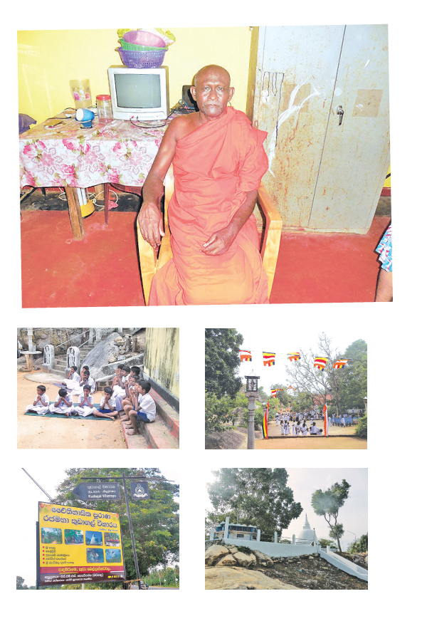 “මේක රජමහා විහාරස්ථානයක් විදිහට තමයි සැලකෙන්නේ. ඒ බව තහවුරු කරන්න පුළුවන් සාක්ෂි ගණනාවක් විහාර භූමියේ අදටත් ඉතිරි වෙලා තියෙනවා. චෛත්ය පිහිටලා තියෙන ගල් පර්වතයට ගොඩවෙන්න සකස් කරලා තියෙන පියගැට පේළිය වගේම පර්වතය මුදුනේ පිහිටුවලා තියෙන සෙල්ලිපිය බොහෝම ඈත අතීතයක් තියෙන සලකුණු විදිහට තමයි දැනට හඳුනගෙන තියෙන්නේ. මේ පුරාණ දේවල් හින්දම නිදන් හොරුන්ගෙන් ලොකු කරදරයක් පන්සලට තියෙන්නේ.