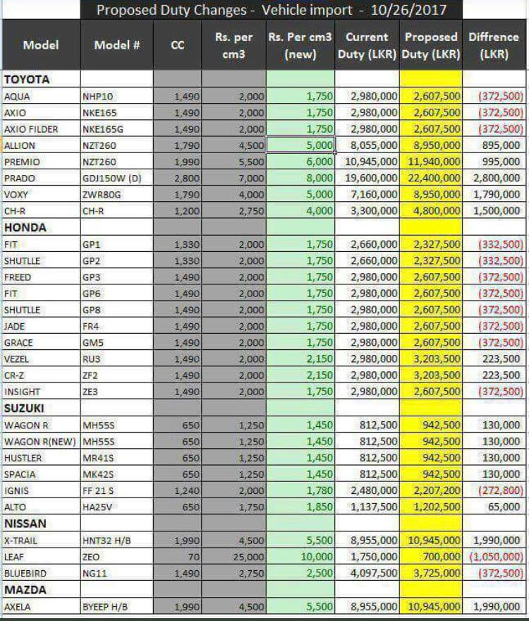 කෙසේවෙතත් මේ කතාව සම්බන්ධයෙන් ලංකා වාහන ආනයනකරුවන්ගේ සංගමයේ සභාපති ඉන්දික සම්පත් මෙරෙංචිගේ මහතාගෙන් කළ විමසීමකදී කියා ඇත්තේ ඉදිරියේදී වාහන මිල ගණන් අඩුවීමේ සම්භාවිතාවයක් තිබුණත් මෙම වගුවේ සත්යතාවයක් නොමැති බවයි.