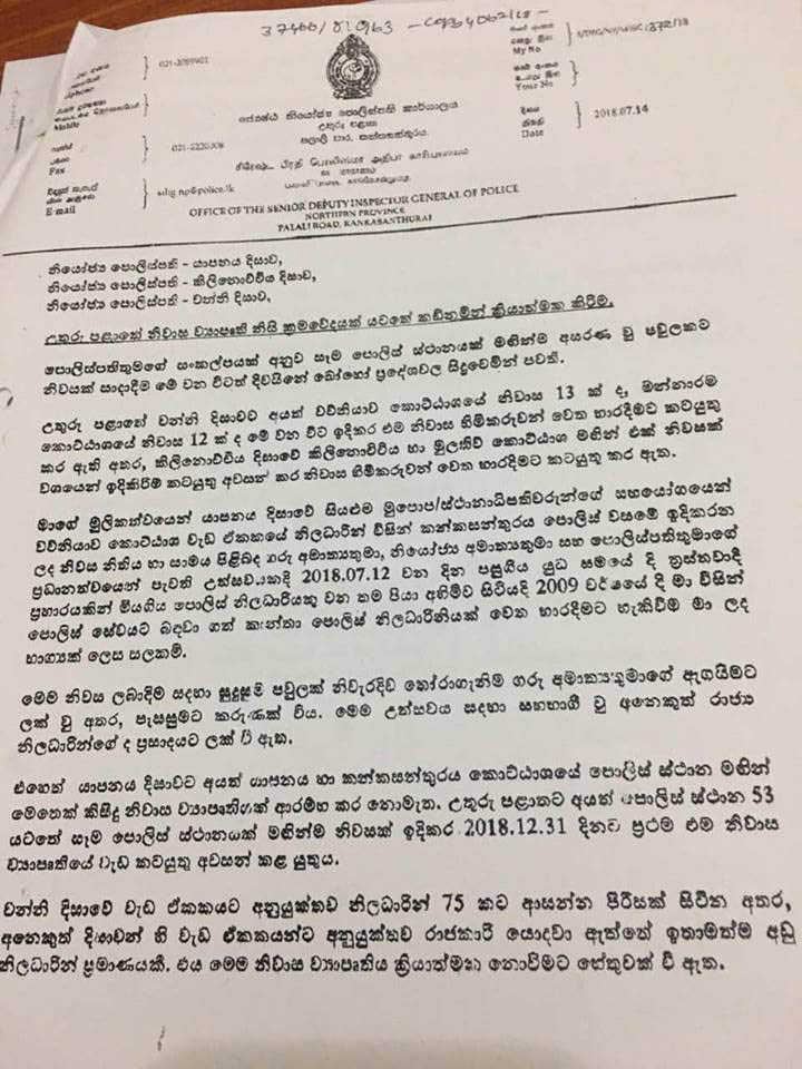 ඒ තමයි උතුරු පළාතේ පොලිස් ස්ථානාධිපතිවරුන්ට ලබාදී ඇති නියෝගයක් ගැන.