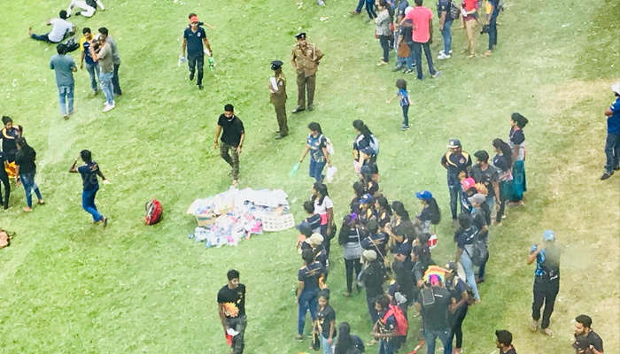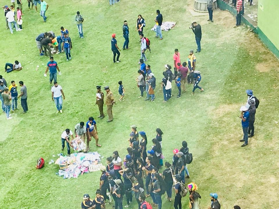 ඒ ඊයේ පැවැත්වුණු තරගය නැරඹීමට පැමිණි ක්රීඩාලෝලීන් විසින් දමාගිය කැළිකසළ එකතු කර ක්රීඩා පිටිය පිරිසිදු කිරීමේ අපූරු කටයුත්තක්.