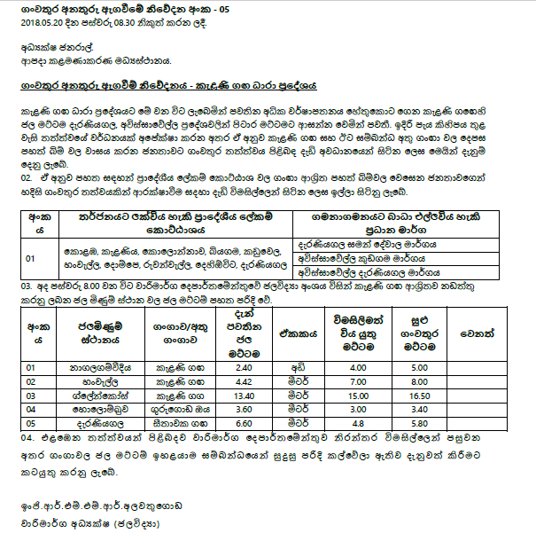 ඒ හේතුවෙන් කැළණි ගඟ අවට ජීවත්වන පහත්බිම් ජනයා විමසිල්ලෙන් පසුවෙන ලෙසද දැනුම් දෙයි.