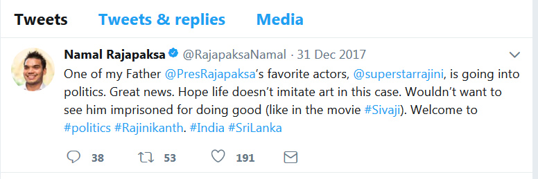 තම පියා වන හිටපු ජනාධිපති මහින්ද රාජපක්ෂ මහතා වඩාත් ප්රිය කරන නළුවෙකු බවත් ජනතාව බලාපොරොත්තු වන්නේ සිනමාවක් සෙ අවසන් නොවන දිගුකල් පවතින දේශපාලන ගමනක් බවත් එම පණිවුඩයේ දැක්වෙනවා.