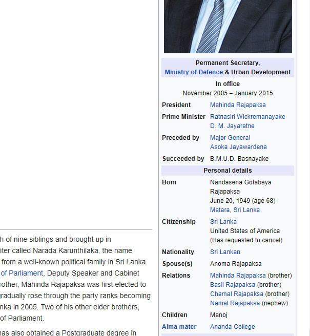 මේ අතර ගෝඨාභය රාජපක්ෂ මහතාගේ ග්රීන්කාර්ඩ් පුරවැසිභාවය අහෝසි කරන්නට කර ඇති ඉල්ලීමද විකිපීඩියා තුළ සඳහන් වුණා.
