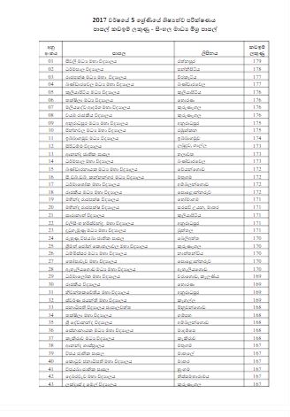 ඒ අනුව සිංහල මාධ්ය පිරිමි පාසල් සඳහා කොළඹ රාජකීය විද්යාලය කඩඉම් ලකුණු 187, මහනුවර ධර්මරාජ විද්යාලය ලකුණු 186, කුරුණෑගල මලියදේව පිරිමි විද්යාලය ලකුණු 186 ක් හා කොළම ආනන්ද විද්යාලය ලකුණු 184 ක් ලෙස ද දක්වා තිබේ.
